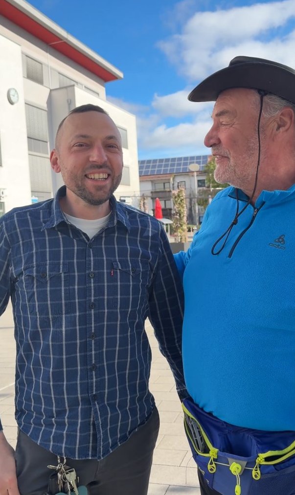 Doch noch bevor wir den ersten Kilometer unter die Füße nahmen, gab es eine wunderbare Überraschung: ein unerwartetes Treffen mit Tobias Kohl. Tobias hat mich bereits auf meiner großen Reise nach Istanbul mit einem Sponsorenbeitrag unterstützt – ihn hier zufällig am Startpunkt zu treffen, war ein tolles Omen für den Tag!